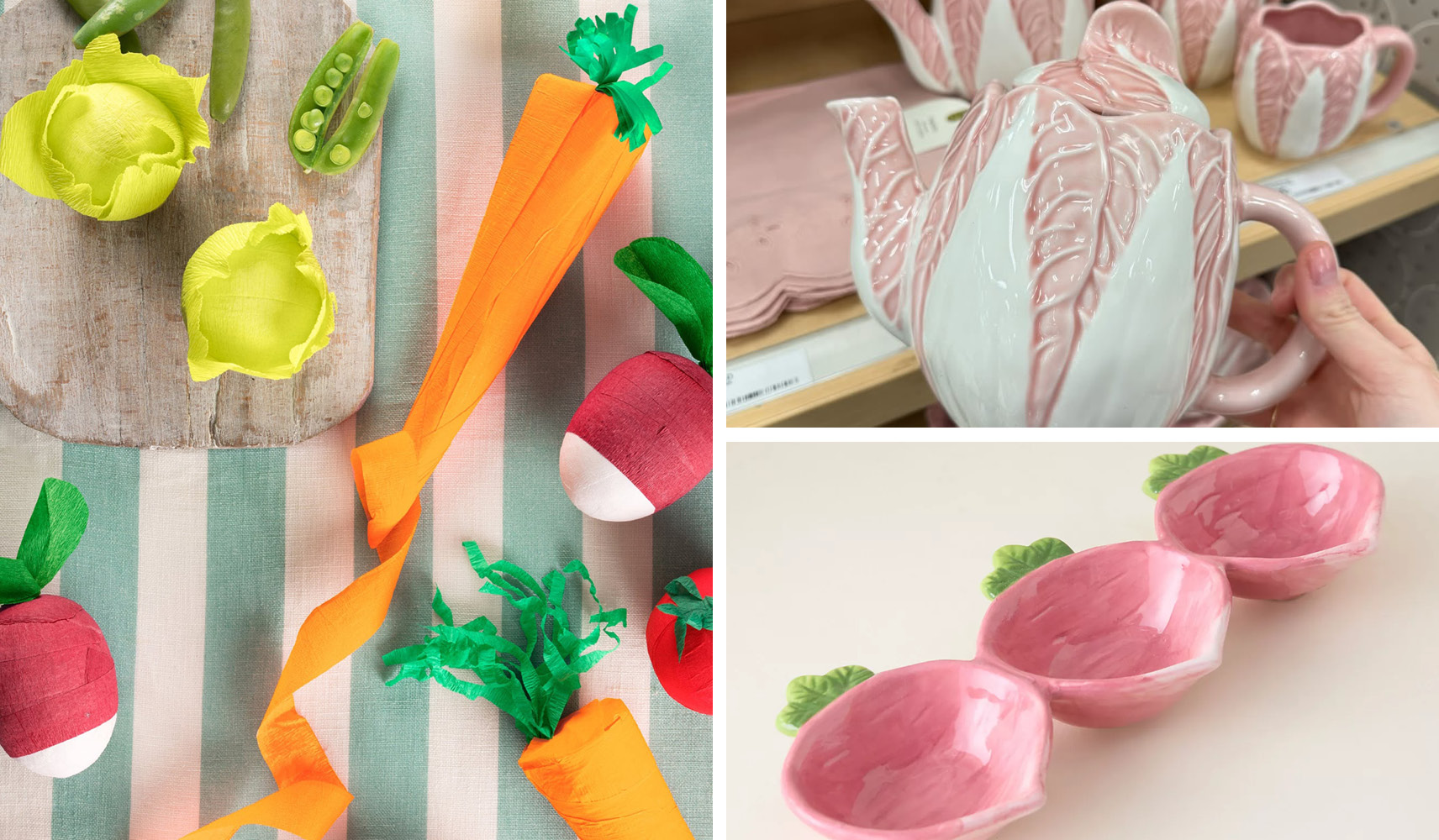 Serveware and decorations mimic the vibrant hues, veined leaves and irregular bulbous silhouettes of radish and radicchio, as seen in Meri Meri, Target and Anthropologie.